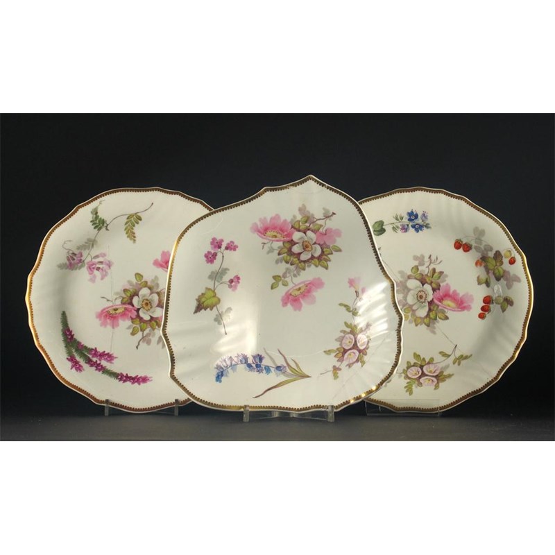 A pair of Daniel plates, and a similar shaped dish, all painted by William Pollard with flowers within gilt dentil borders, no marks. All damaged. c.1820, 23cm. (3)