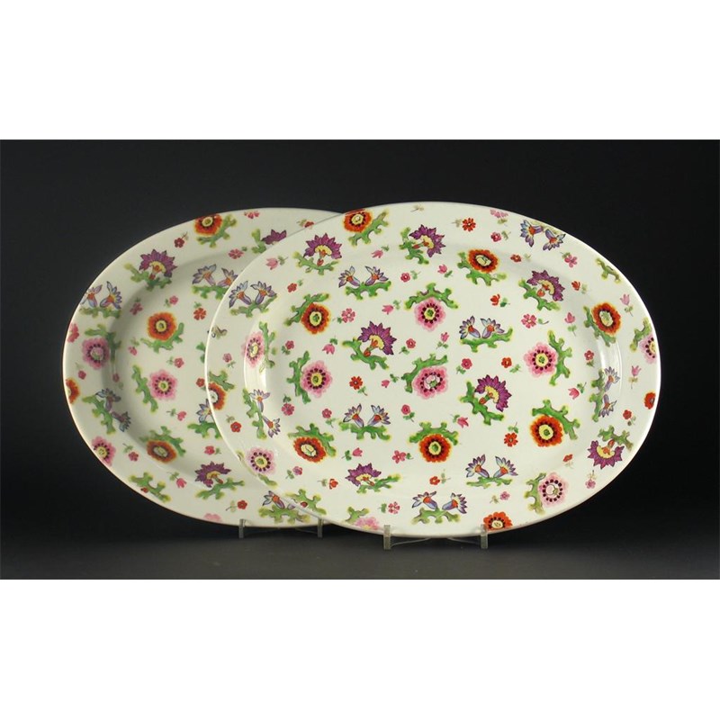 A pair of Swansea oval dishes, brightly painted with the 'Marino Ballroom' pattern, one with 'Swansea' and crossed tridents impressed, c.1820, 36cm. (2) Cf. Morton Nance , CL1F for a similar dish.