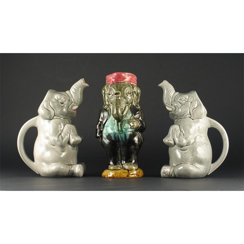 Two Sarreguemines grey glazed elephant jugs, and a Majolica standing elephant jug, 19th/20th century, 27cm. (3)