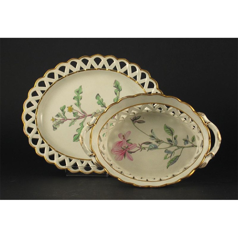 A Spode pearlware basket and stand, painted with botanical specimens, titled and with impressed factory marks. The basket with a faint rim crack. c.1820, 23cm. (2)