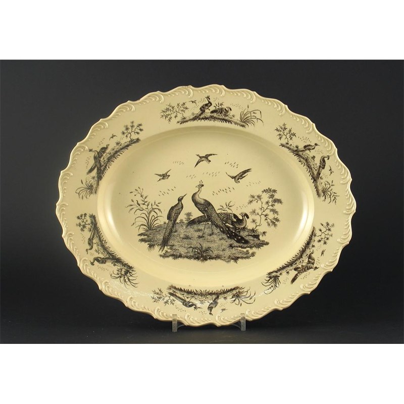 A creamware oval dish, with a feather moulded rim, printed in black with peacocks and other birds, unmarked, c.1770, 33.5cm.