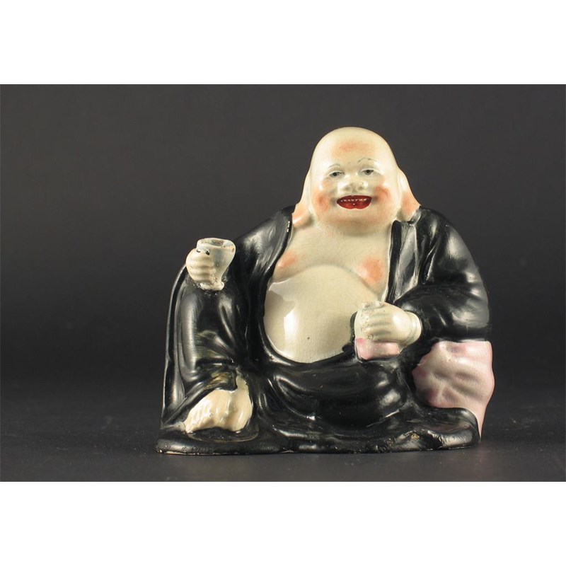 An unusual pearlware model of Budai Hoshang, seated holding a goblet and a flask and wearing a black robe. A chip to his bottle and a faint crack to the reverse. c.1800, 11cm.