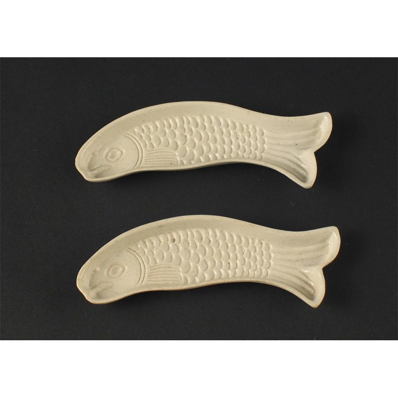 A pair of rare Staffordshire white saltglazed stoneware fish moulds. Small hair cracks. c.1750-60, 10cm. (2)