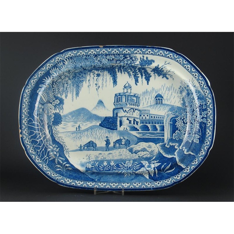 A large blue and white pearlware meat dish, printed with figures and horses beneath a castle, '20' impressed. Small rim chips. c.1820, 53.5cm.