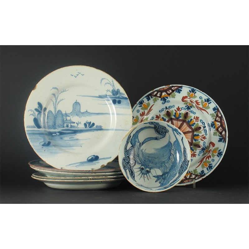 Six various Delft plates, and a Delft bowl painted with a dragon. All damaged. All 18th century, 23cm. Max. (7)