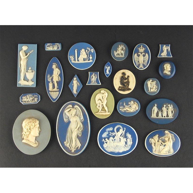 Twenty one Jasperware plaques, ten marked Wedgwood, one marked Wedgwood & Bentley, the remainder unmarked, 18th century and later, 6.5cm. Max. (21)