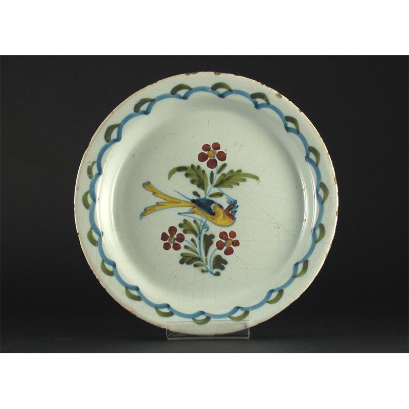 A Delft plate, painted in polychrome with a bird perched on a flowering stem, early 18th century, 22cm.