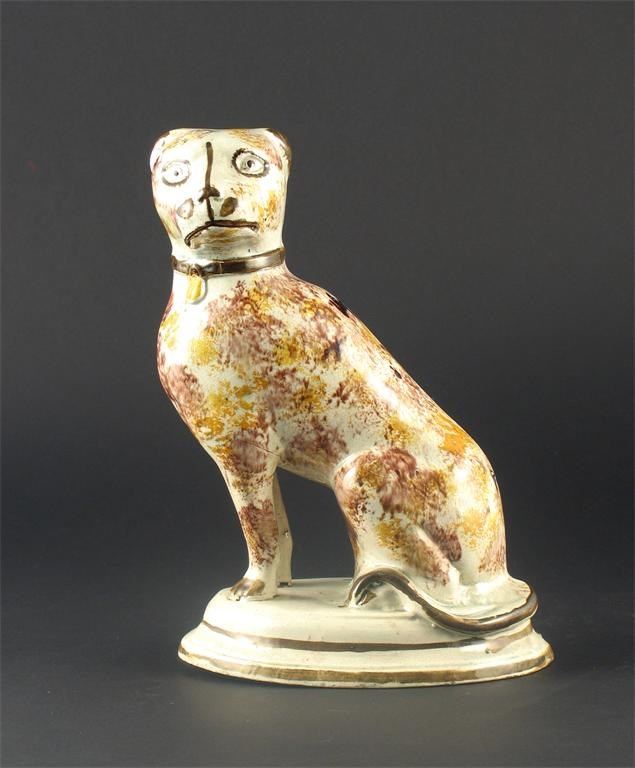 An unusual Prattware model of a seated dog, with his head turned to sinister, decorated with manganese and ochre sponging and brown details to his head and the oval base. A few firing faults. c.1800, 22.5cm.