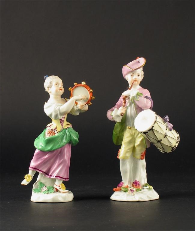 Two Meissen models of musicians, the young man plays a pipe and carries a drum while his companion plays a tambourine, crossed swords marks. A restored chip to his jacket. Mid 18th century, 13.5cm. Max. (2)