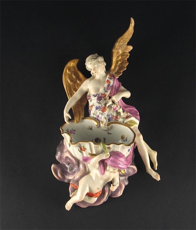 A Continental porcelain wall font, supported by a putto and surmounted by an angel, unmarked. Some restoration. Late 19th century, 29cm.
