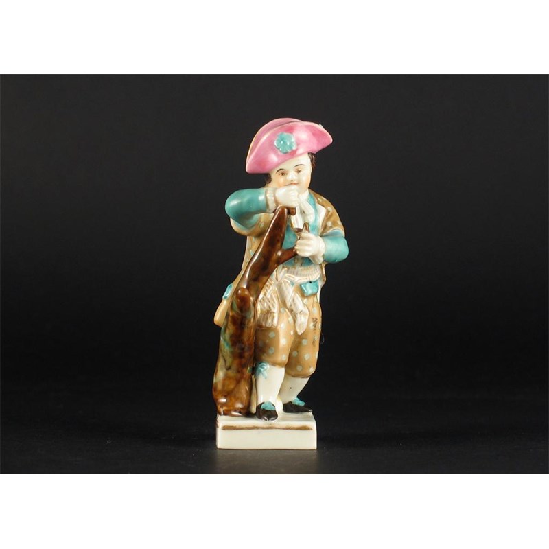 A Russian porcelain model of a boy gardener, wearing a pink hat and raised on a square base, an impressed mark. Restoration to his arms and the tree. 19th century, 10cm.