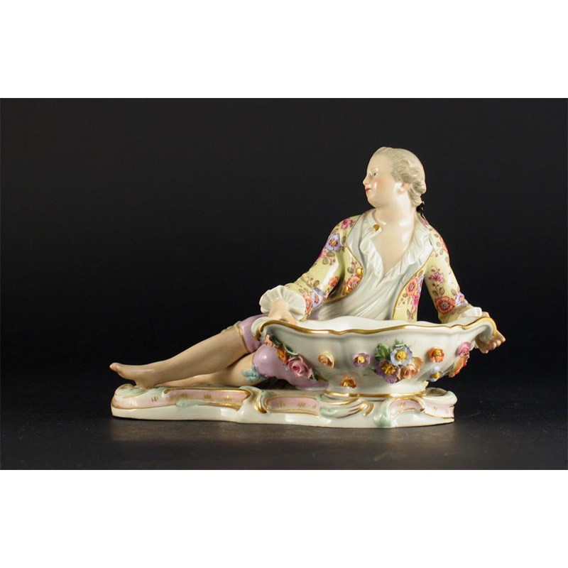 A Meissen figural sweetmeat, with a reclining man wearing a flowery coat, crossed swords mark. Restoration to extremities. Late 19th century, 18cm.