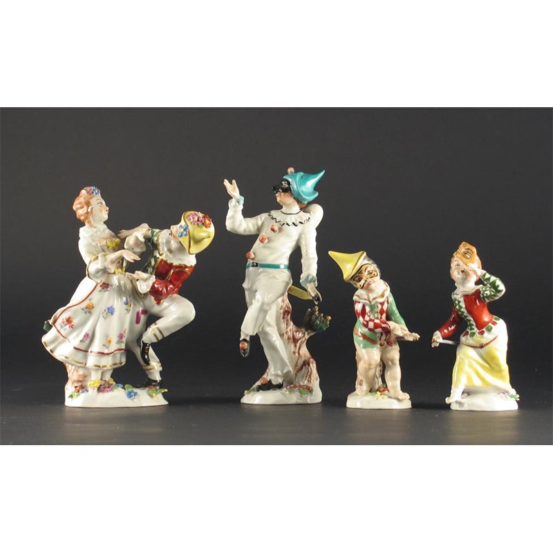 Four Continental porcelain models from the Italian comedy, all brightly enamelled, crowned 'N' marks, 20th century, 16cm. (4)