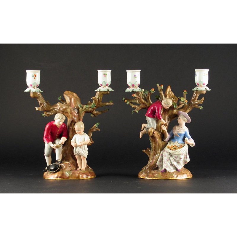 A pair of Meissen candlestick groups, one with a father and child collecting eggs, the other with a boy passing apples to his mother, crossed swords marks. Restoration, the sconces probably replacements. Late 19th century, 23cm. (2)