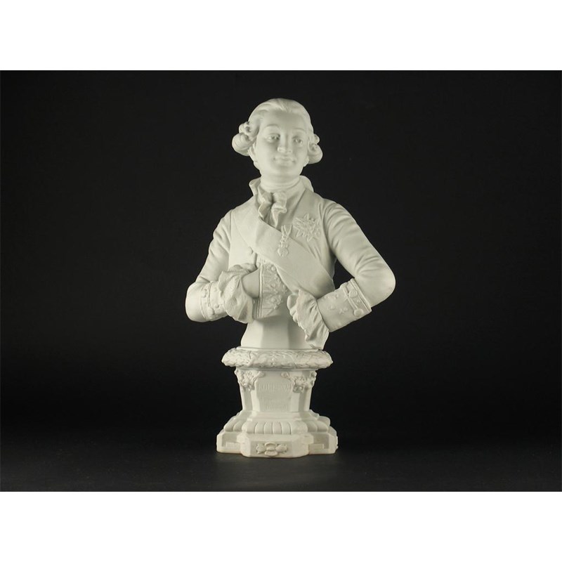 A Continental biscuit porcelain bust of Louis XVI, titled and raised on an elaborate plinth, c.1900, 34.4cm.