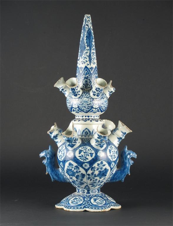 PLEASE NOTE: IT IS POSSIBLE THAT THE UPPER SECTION IS ASSOCIATED A Dutch Delft blue and white tulip vase and cover, painted with panels of flowers and fish on the finial. Extensively chipped. 18th/19th century, 46.5cm.