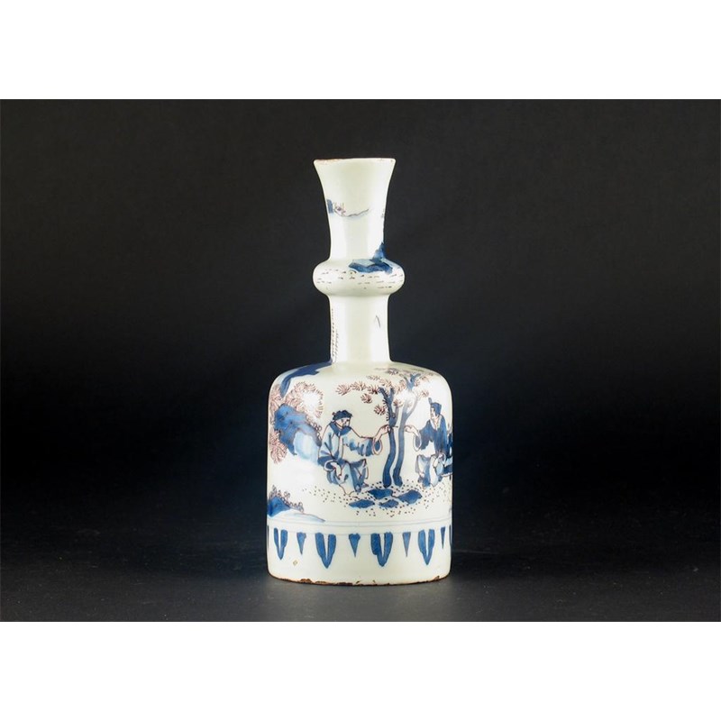 A German faence vase, with a cylindrical body, painted with figures and a pine tree, painted mark. Restoration to the neck. 18th century, 19cm.