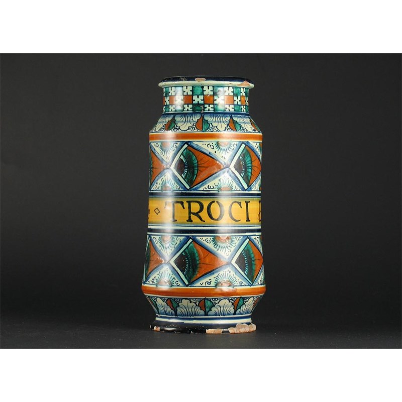 An Italian maiolica albarello, inscribed on a central band 'Troci D Tera' between stylized kite-shaped motifs, the base with a painted mark, probably for Cantigalli. Footrim chips and drilled. 19th century, 23cm.