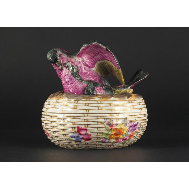 A Dresden box and cover, formed as a nest surmounted by two colourful birds, cross mark. Restoration to one tail. Late 19th century, 11cm. (2)