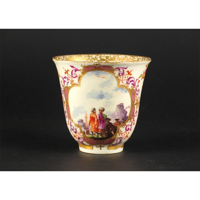 A Meissen beaker, painted with two panels, one containing Turkish figures wearing turbans, the other with a landscape scene, a blue enamelled crossed swords mark and gilt 'T'. Broken and well restored. c.1730, 7.2cm.