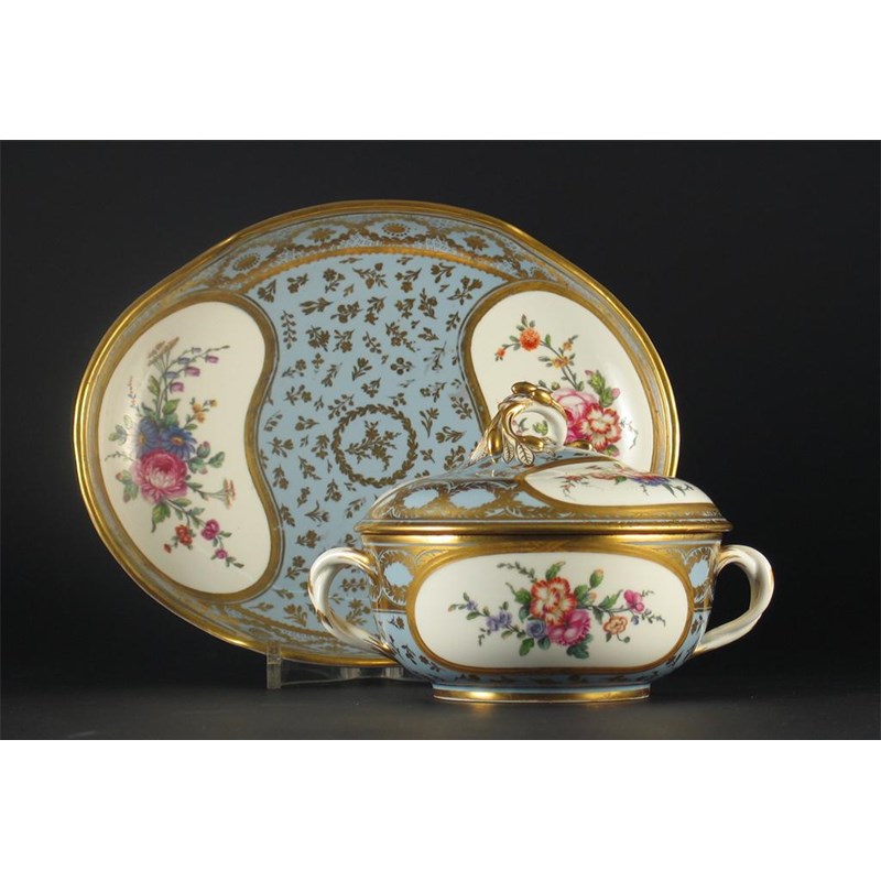 A Svres ecuelle, cover and stand, painted with panels of flowers on a gilt decorated lavender ground, painted Svres style marks, 1774, 23.5cm.