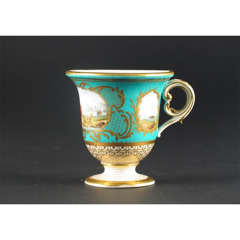 A Svres style bell-shaped cup, on a flared foot, painted with figures and cattle before a lake and two panels of sailing boats on a gilt decorated turquoise ground. A 6mm rim chip. A gilt crossed L's enclosing W, 6.5cm.