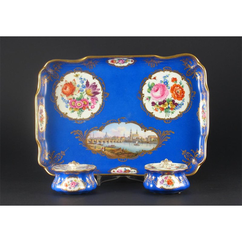 A Meissen inkstand, with a well and cover and a sander, painted with views of Dresden, Pillnitz and Wesenstein and with panels of flowers on a blue ground, crossed swords marks, late 19th century, 28cm. (4)