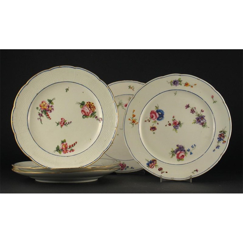 Five Svres plates, all painted with colourful flowers, all with interlaced 'L's marks. One probably re-fired, some wear. 18th/19th century, 24.5cm.