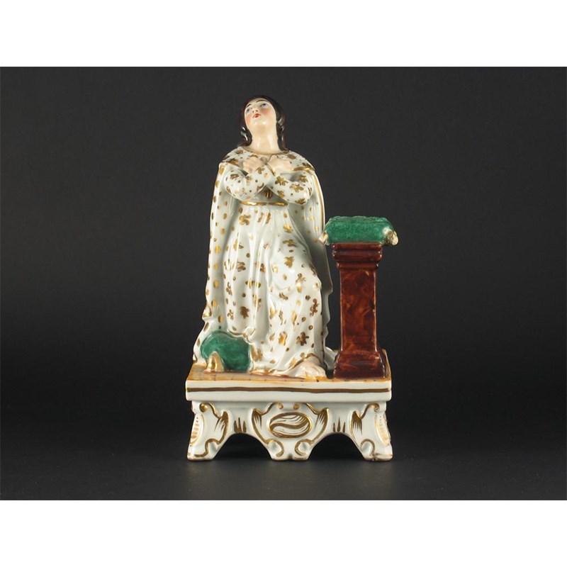 A French porcelain model of a Saint, kneeling beside a plinth, unmarked. One cushion tassel chipped. Mid 19th century, 24cm.