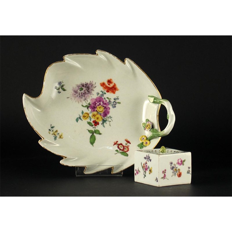 A Meissen sander, with a cone finial and square body together with a Meissen leaf shaped dish, both painted with Deutsche Blumen and with crossed swords marks. Minor faults. Both 18th century, 22cm. Max. (2)