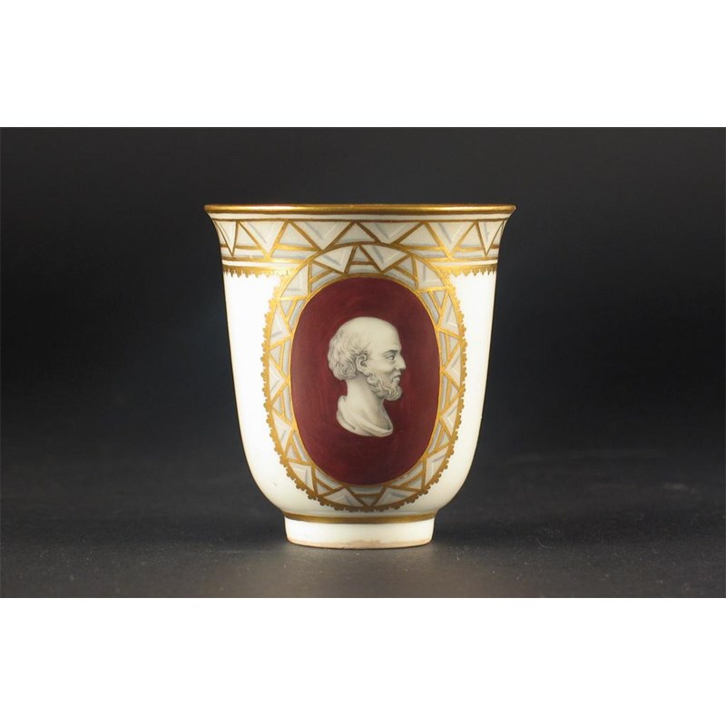 A Vienna U-shaped cup, with an ear-shaped handle, painted with a portrait of a man in an oval panel, incised and shield mark, 18th century, 7cm.