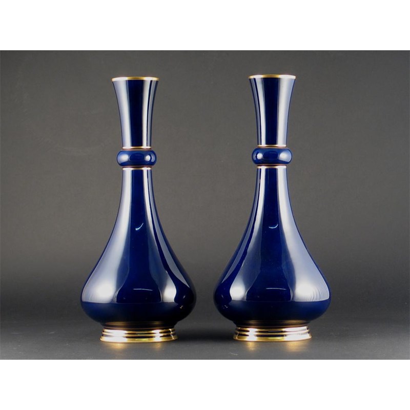 A pair of Svres blue ground vases, detailed with gilt bands. One with small footrim chips. Printed marks and dated 1877, 32.5cm.