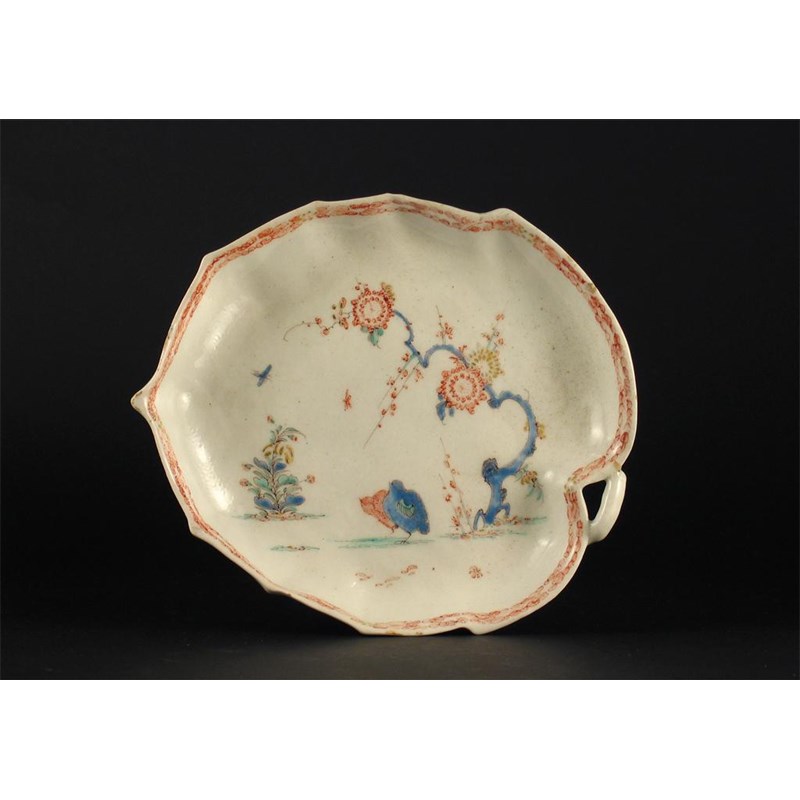 An early Bow leaf moulded dish, standing on six moulded feet, painted in pale coloured enamels in the Kakiemon style with the 'Quail' pattern. Minor faults and a later incised triangle mark c.1750-55, 17.5cm.