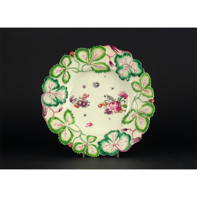 A Longton Hall strawberry dish, the centre painted with flowers, the border moulded with leaves and berries picked out in coloured enamels. Two restored rim cracks. c.1755, 22cm.