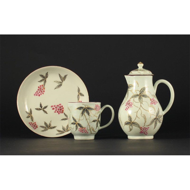 A Chaffers Liverpool sparrow beak jug and cover, painted in pink, black and gilt with a fruiting vine, c.1760. Provenance: The Rous Lench Collection, Christie's 1990, lot 386. Together with a matching Chaffers coffee cup and a Chinese saucer. A few small chips to the saucer. 12.5cm. Max. (4)