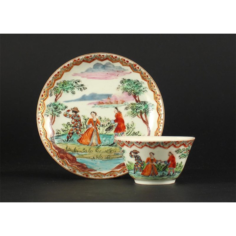 A rare Dutch decorated Japanese teabowl and saucer, painted with Harlequin and a courting couple in a landscape framed by trees, the porcelain c.1720, the decoration c.1740. (2) Cf. H Espir, European Decoration on Oriental Porcelain, p.167