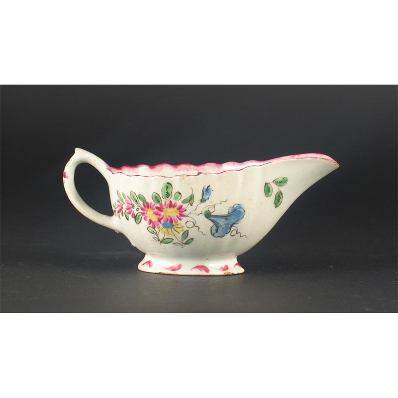 A Bow fluted creamboat, painted in the famille rose palette with colourful flowers, c.1765, 12.5cm.