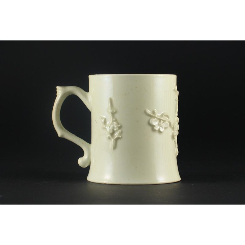 An early Bow mug, flaring towards the base, white glazed and applied with three moulded prunus sprigs, scratch mark, c.1750-55, 9cm.
