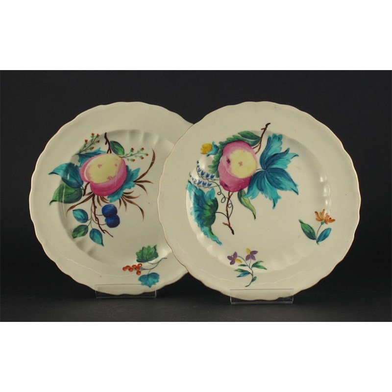 A pair of Derby plates, brightly enamelled with fruit and flower sprigs, unmarked, 2nd half 18th century, 22.5cm. (2)
