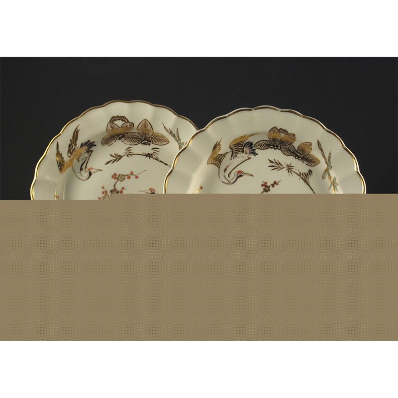 A pair of Derby fluted plates, decorated after Imari originals with two birds amidst flowers and foliage. A little wear to the gilding. c.1770, 20.5cm. (2) Provenance: Raybe Castle.