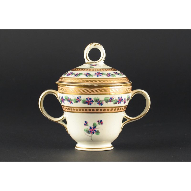 An unusual Caughley two-handled cup and cover, painted with bands and sprigs of flowers within orange and gilt borders, no marks, c.1780. (2)