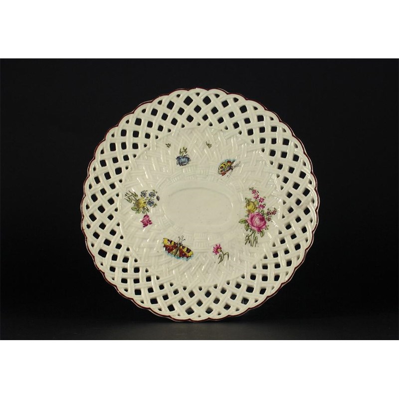 A Longton Hall reticulated stand, basket moulded and painted with colourful butterflies and flower sprays, a brown line rim, no marks. Firing faults and a rim crack. c.1755, 20cm.