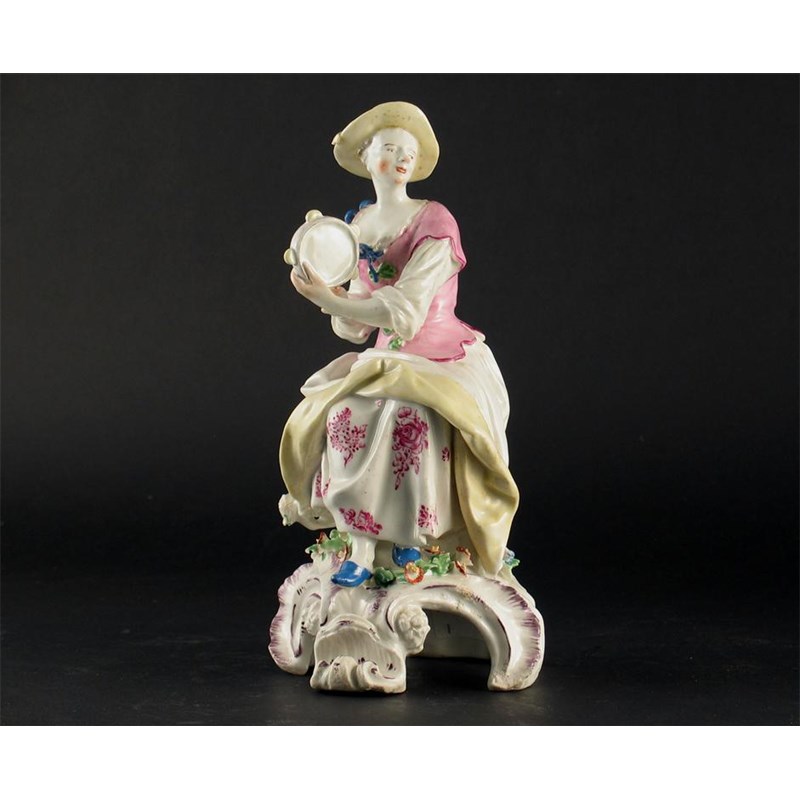 A Bow model of a tambourine player, seated on a high scroll base in a pink bodice and pale yellow hat. Some damage and restoration. c.1765, 22cm.