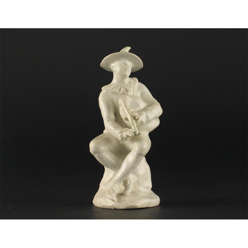 A Bow white glazed model of a harlequin, seated playing the bagpipes. Restoration to his hat, fingers and pipe. c.1760, 12cm.
