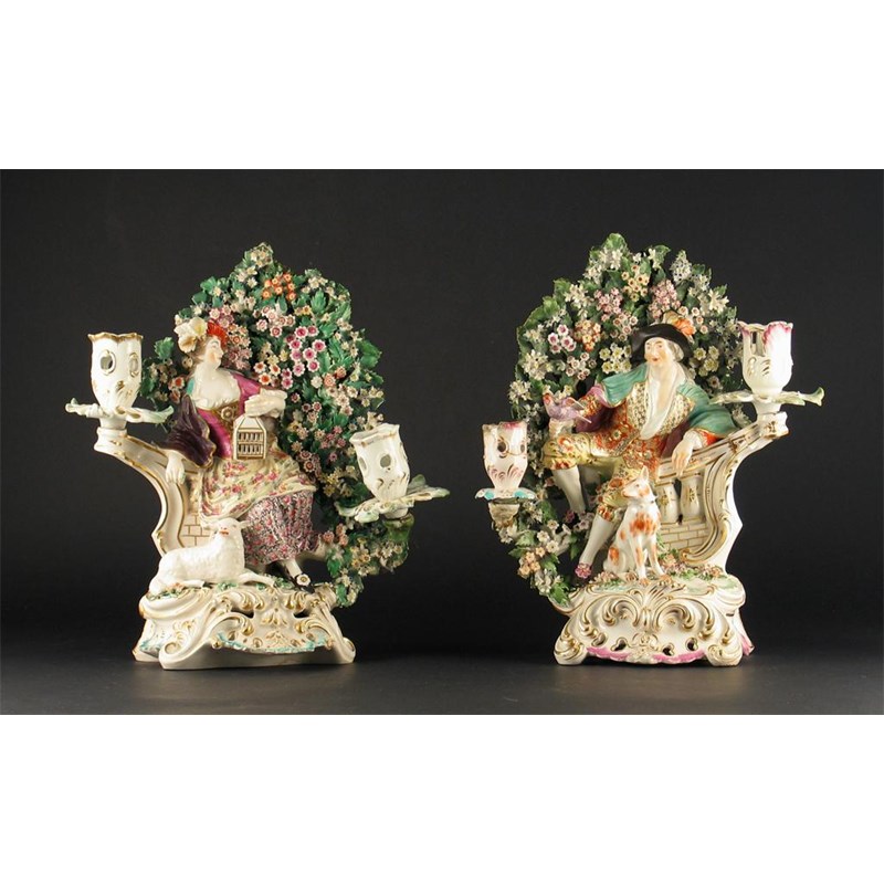 Two large Derby candlestick groups, of a young man and woman before flowers and leaves, each raised on an elaborate scrolling base. Some damages, c.1765, 30cm. (2)