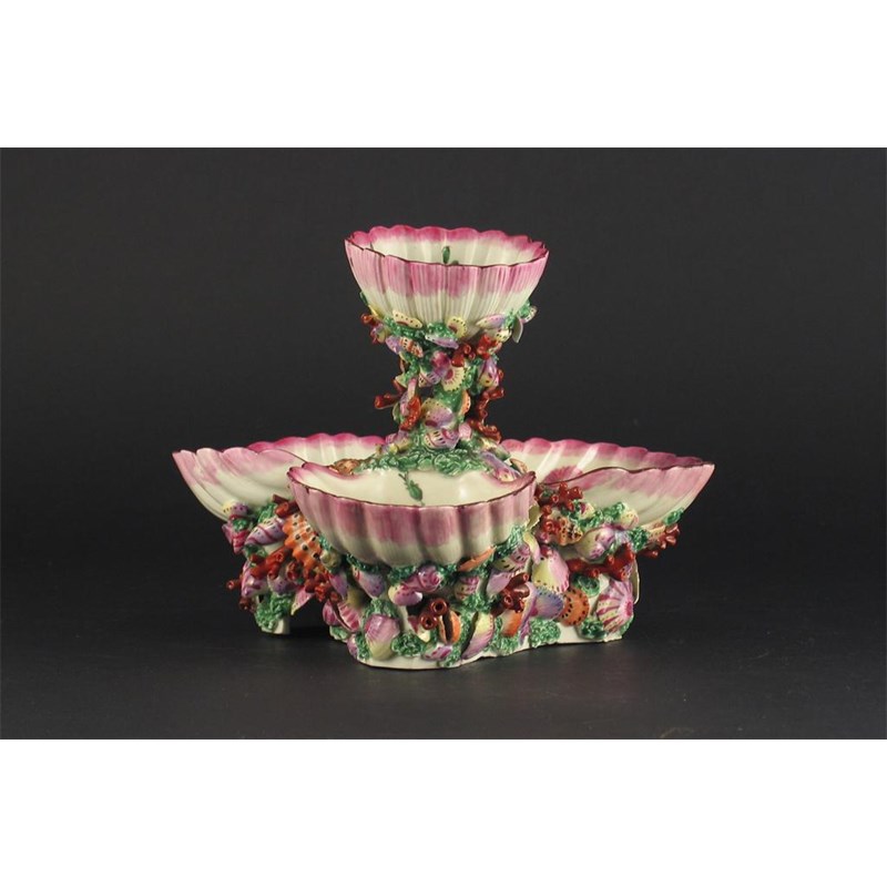 A Worcester shell centrepiece, formed with four shells supported by coral and many small colourful shells. Restoration. c.1770, 16cm. High.