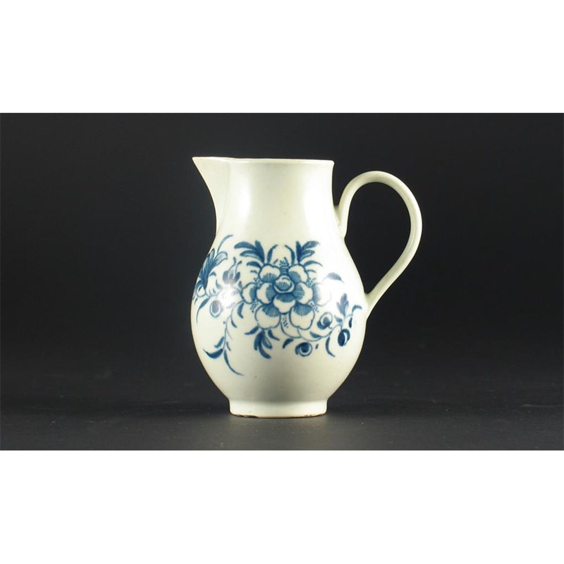 A small Worcester sparrow beak jug, painted with the 'Mansfield' pattern, crescent mark. Small footrim chips and a scrape to the spout. c.1770, 9cm.