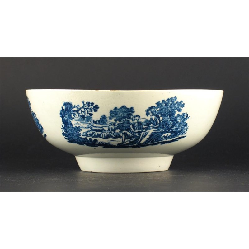 A Liverpool bowl, printed in blue with three panels of figures and sheep and with further sheep to the centre. A few tiny rim nicks. c.1770-80, 21.2cm.
