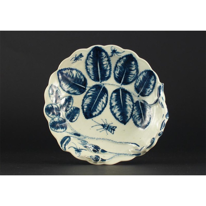 A Worcester blue and white blind earl dish, painted with four winged insects, the leaves naturalistically detailed, crescent mark. A restored rim chip. c.1760, 15cm.
