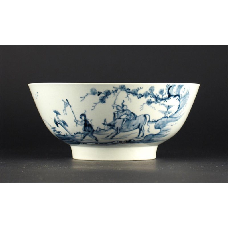 A William Reid blue and white bowl, loosely painted with the 'Boy on the Buffalo' pattern and with a scrolling inner border. Broken and repaired. c.1756-61, 18.8cm. Provenance: The Watney Collection and Roderick Jellicoe.